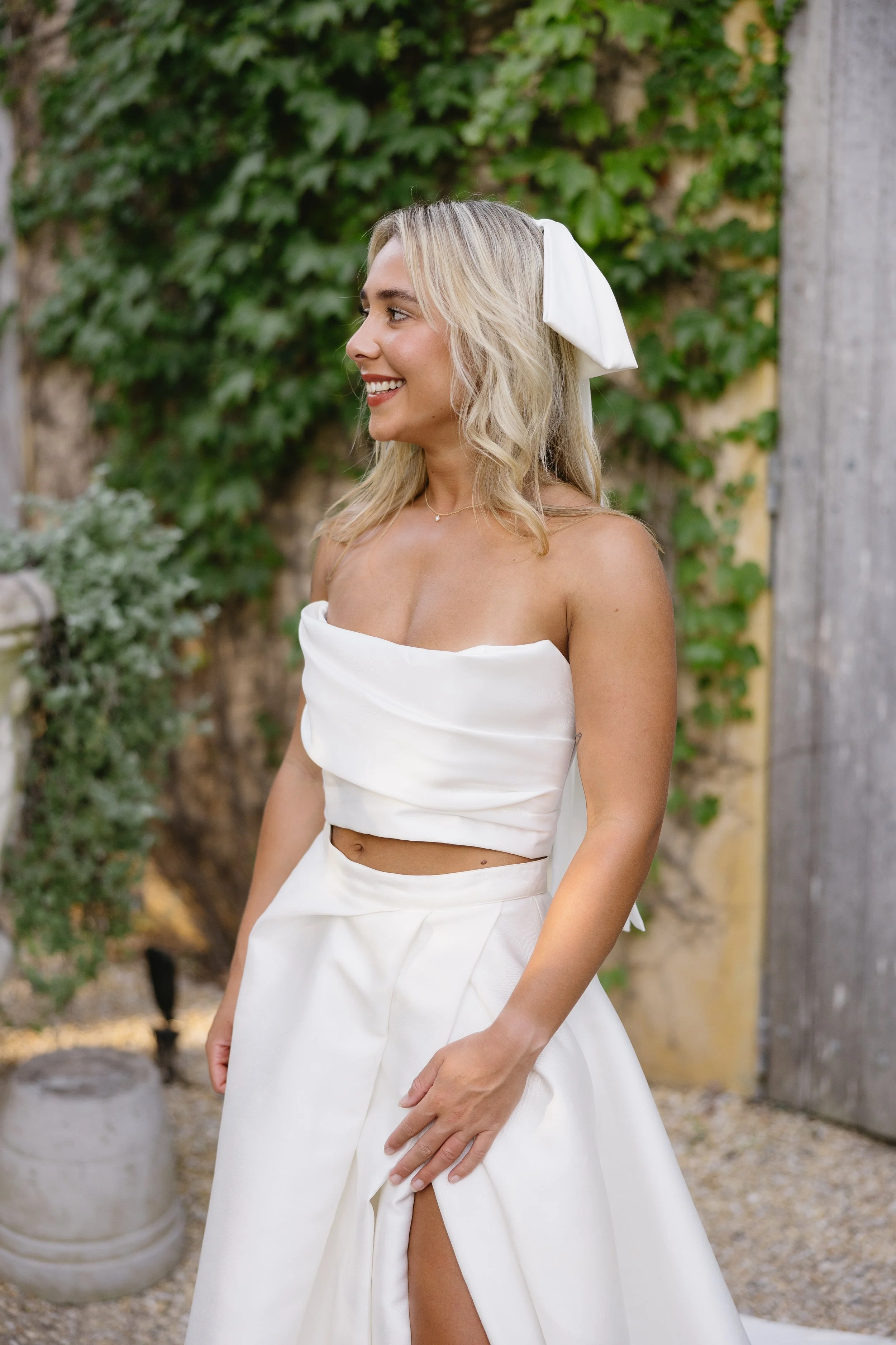 A woman in a white strapless top and matching skirt with a slit, smiling and looking to her left, standing outdoors with a background of green ivy and wooden structures.